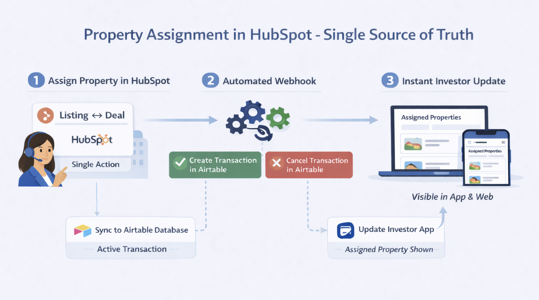 HubSpot is now the single source of truth for property assignment. Coaches assign and manage properties directly in HubSpot (Listing ↔ Deal). From there, the system handles the rest: An active transaction is automatically created in Airtable If a property is removed, the transaction is automatically cancelled The investor app reflects the update instantly